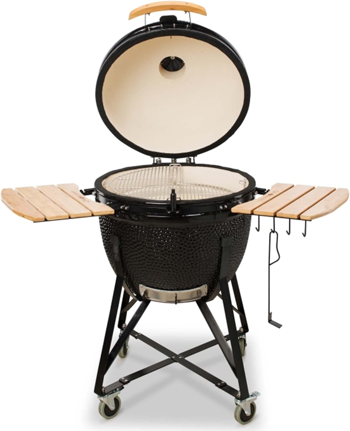 - INCLUSO: Kamado in ceramica con carrello in acciaio antiruggine, 2 ripiani laterali in legno duro, sfiato superiore completamente apribile, guarnizione in fibra di vetro, sistema di cottura a due zone, deflettore di calore in ceramica, coperchio della griglia, strumenti per carbone, paletta raccogli cenere, supporto per pollo, termometro, libro di ricette per BBQ/grill (EN). MISURE: Altezza barbecue 78 cm, altezza con carrello 120 cm, diametro 59 cm, con ripiani aperti 129 cm, griglia 49 cm