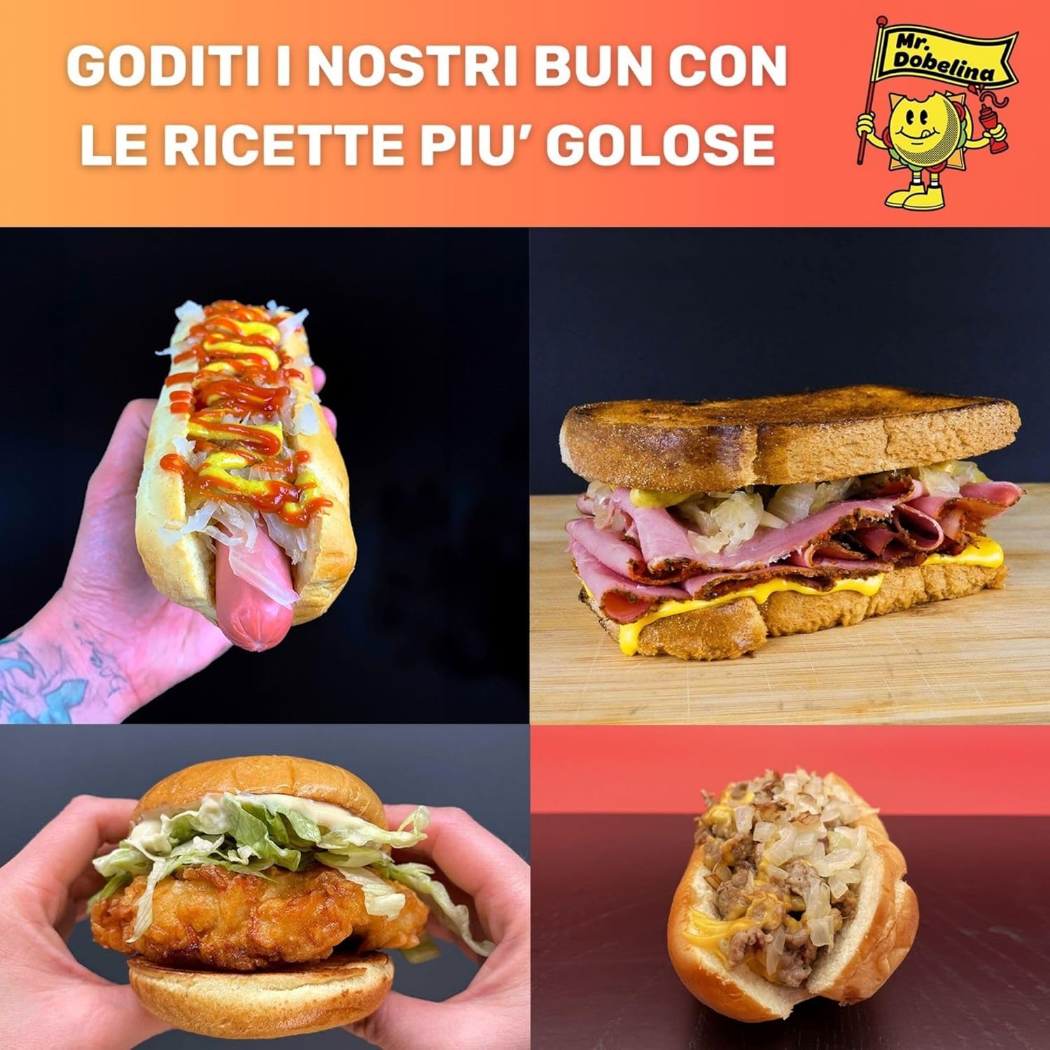 I nostri panini morbidi e soffici sono il risultato della nostra passione, realizzata con passione in Italia. I Potato Roll Buns, perfetti per hamburger succulenti, gli Hot Dog Buns, ideali per hotdog gustosei, e il Sandwich Bread, versatile per creare deliziosi panini farciti. Gusta l’autentico sapore americano con i nostri prodotti realizzati con ingredienti selezionati e amore per la tradizione. Fai del tuo street food un’esperienza indimenticabile con i nostri panini irresistibili. Autentico sapore americano: I nostri Mr.Dobelina buns catturano il sapore e la consistenza unici dei celebri potato rolls made in USA, proprio come quelli utilizzati nei migliori burger joint americani come Shake Shack e in quelli italiani come Burgez.