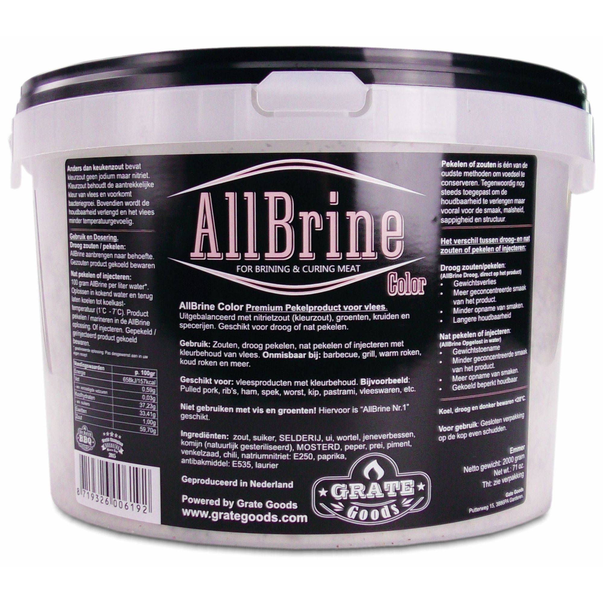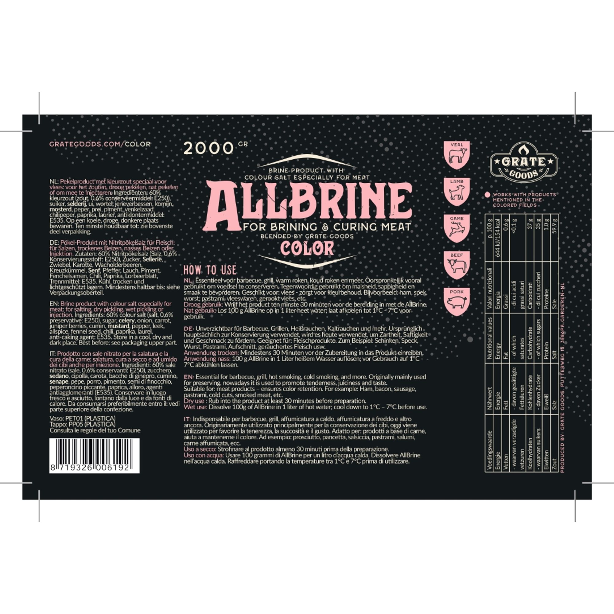 La nostra salamoia AllBrine Color è perfetta per la carne dove la conservazione del colore è importante, come il pastrami o la carne di maiale. Il naturale colore del prodotto è mantenuto grazie all’aggiunta di sale colorato. AllBrine Color contiene nitrito che previene la crescita di batteri, estende la dutata della vita della carne e rende la carne meno sensibile alla temperatura. Utilizza Allbrine Color solo per salare, salamoia a secco o umida e per iiniezione. E’ adatta per affumicature a caldo o a freddo o ad esempio, nelle grigliate di carne di maiale, nelle costine, nelle salsicce, nel bacon o nel pastrami. E’ disponibile in confezione da 800 g e 2000 g.