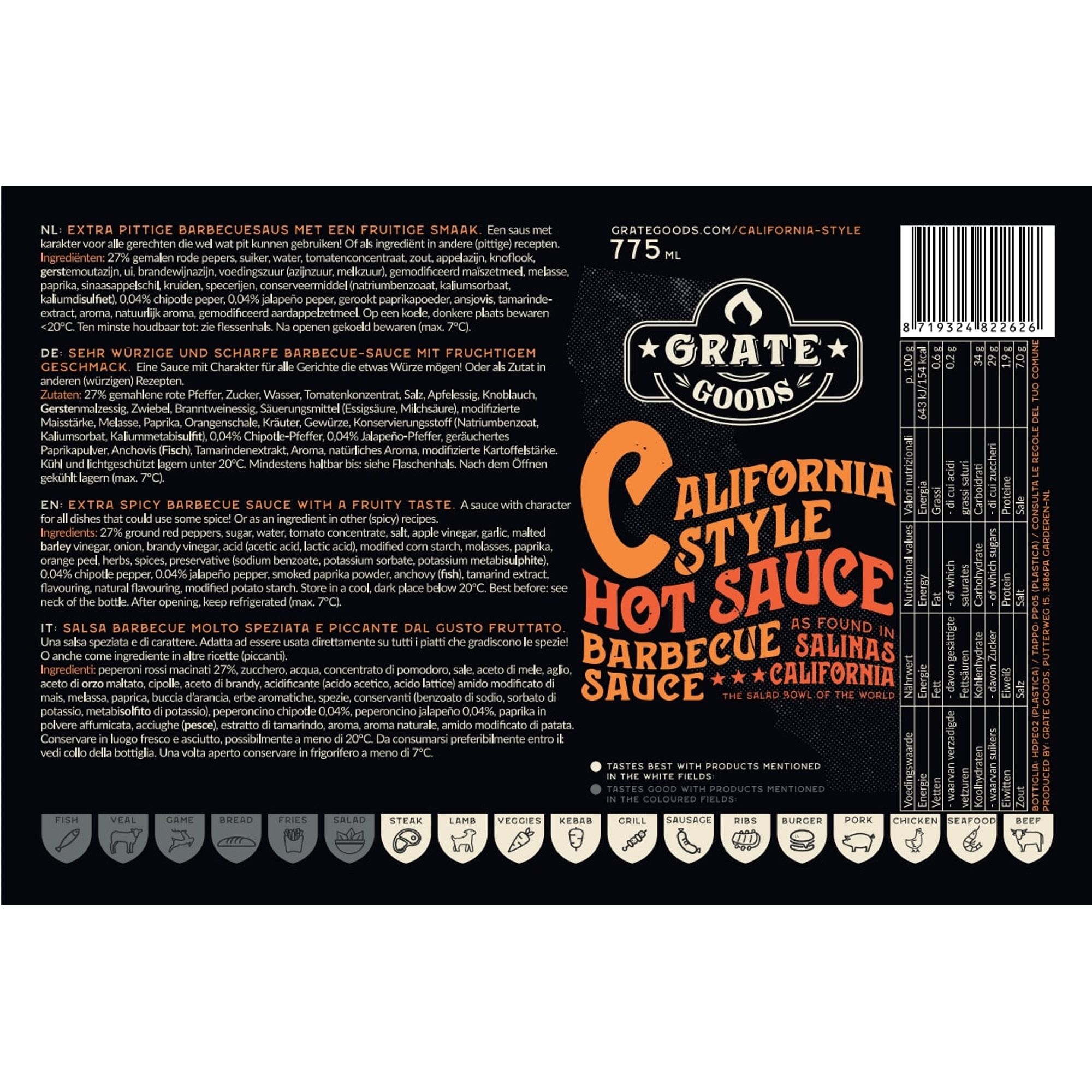 Questa salsa di origine Thailandese veniva spesso utilizzata come salsa di accompagnamento per il pesce, i crostacei e i molluschi. Diventata famosa anche in California dove nascono numerose varianti. La nostra versione inconfondibile è caratterizzata da un gusto piccante e fruttato. Non abbiamo bisogno di esaltatori di sapore! Nella nostra salsa ci sono solo le migliori erbe aromatiche, spezie ed esclusivamente peperoni freschi! Questa salsa è adatta a tutti quei piatti che si sposano bene con il piccante. Suggeriamo di aggiungerla infatti come ingrediente di salse (piccanti) o condimenti. La “California Hot Barbcue Sauce” è disponibile in confezione da 265ml o 775 ml.